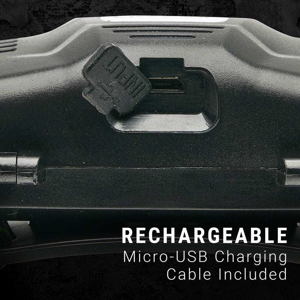 The headlamp features three brightness modes and is powered by two replaceable 18650 rechargeable batteries (included) and is constructed of extremely durable aerospace grade aluminum.