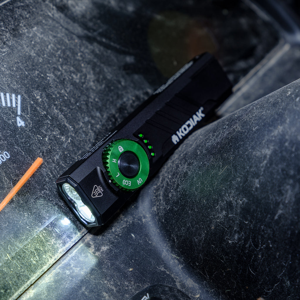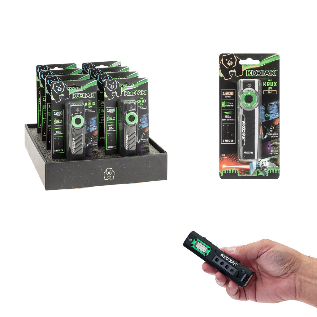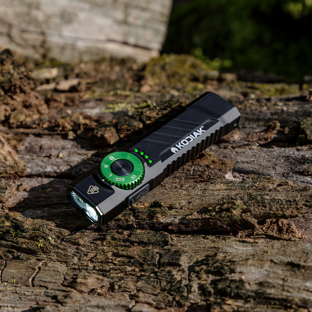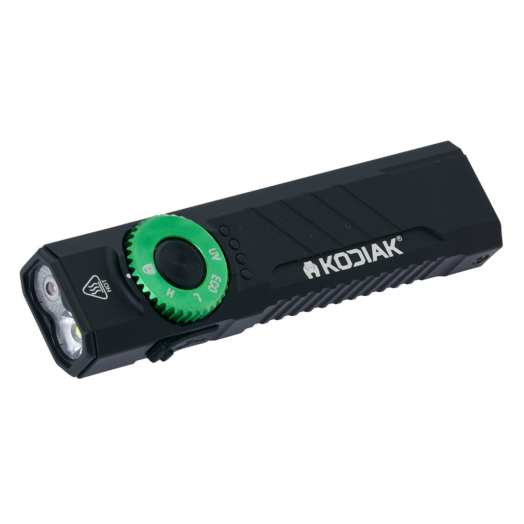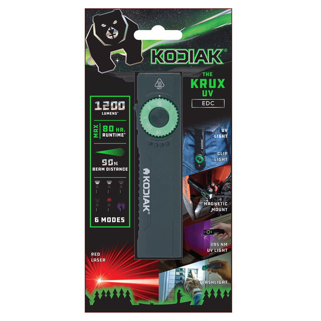 The Kodiak® Krux is a low profile rechargeable flashlight with a UV light and red laser pointer.