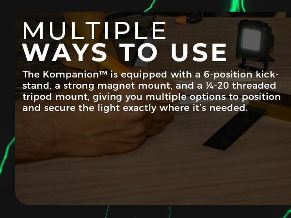 What did the world do for light before the Kompanion? It often went without! Now that it's here, I find new uses everyday. Today I l;it up installing a sump pump, as the magnet handily hung it where it copuld do the most good.\n\nI'm a model railroader and it has a multitude of uses. When building models, it can be a handy extra source of light on the workbench. Working around and under the layout, the small size of the Kompanion can throw light anywhere it's ,needed. The nice color temp/CRI of the Kompanion makes it esepcially useful for supplying the right lighting from the rioght angle, yielding superior results.\n\nI've also discovered a potential use. Europeans have a fog lamp standard that usual;ly includes an extra bright single red rear tail.light.You can see the knockout locations foe these lamps in many imported European car bumpers, a size which happens to be just about the same as the siz of the Kompanion, which happens to be significantly (but not over bright) brighter than stock tailights. If I ever get caught in a thick fog, hanging a Kompanion facing the rear in Red mode will improve my safety on an emergency basis. I recommend a safety lanyard so you don't have to depend solely on the magnet for mounting.