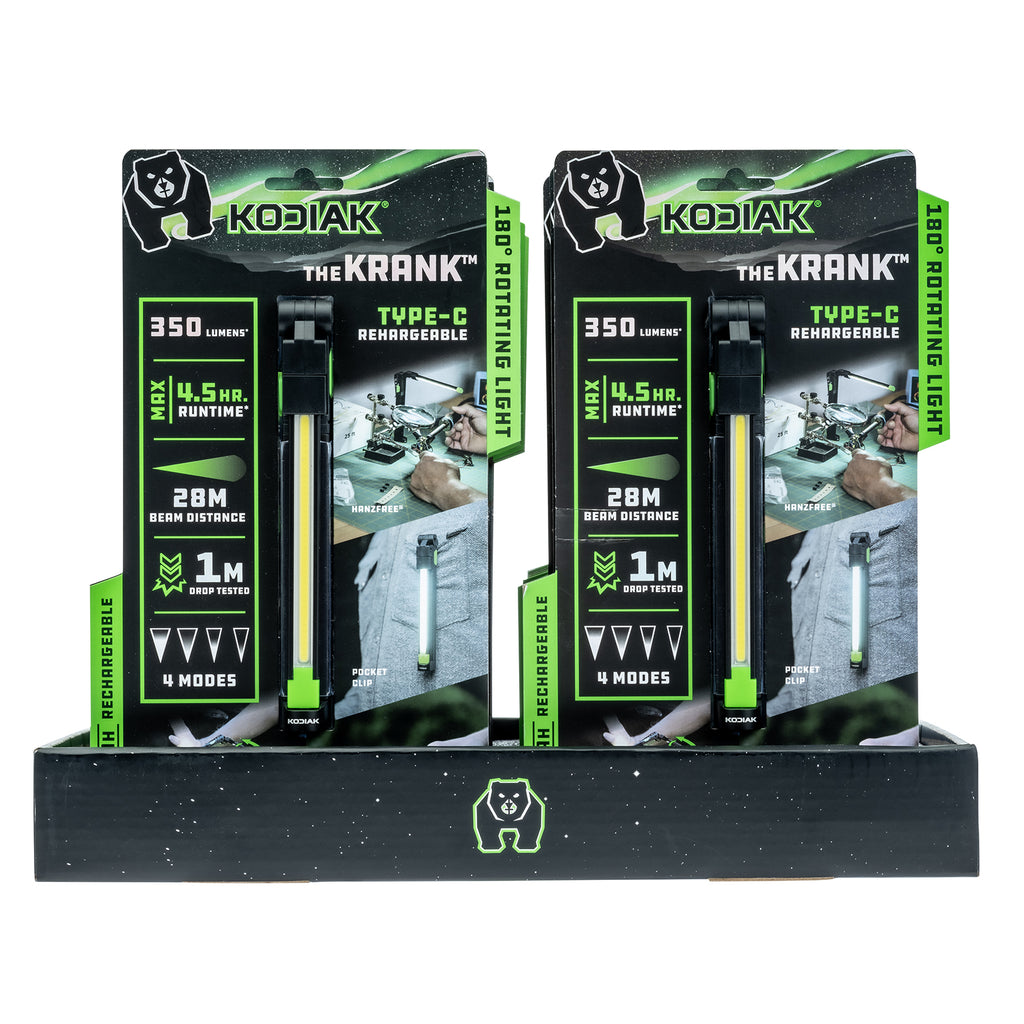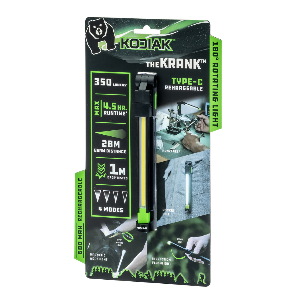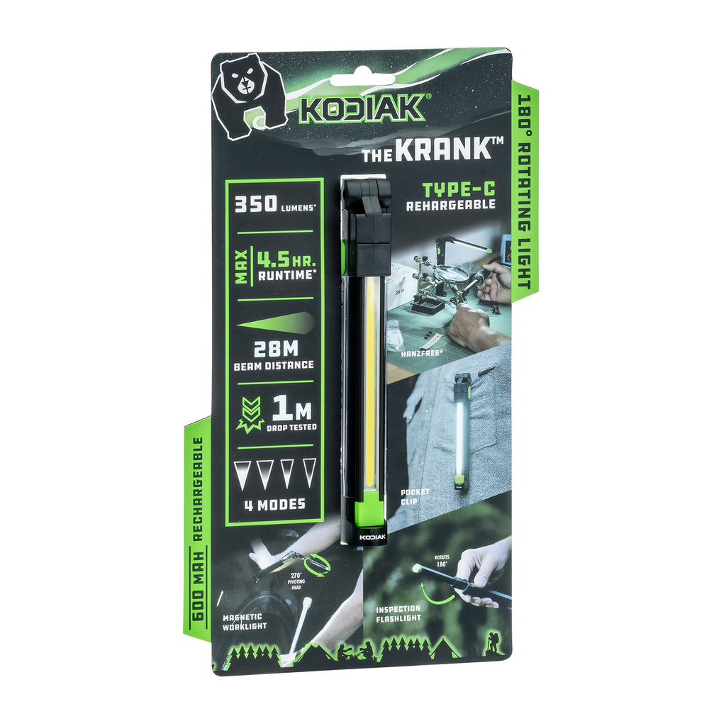 Meet the Kodiak® Krank, your go-to rechargeable work light for any task. Built tough with a 1M impact rating, this versatile light delivers powerful illumination wherever you need it — in the garage, workshop, or on the job site.