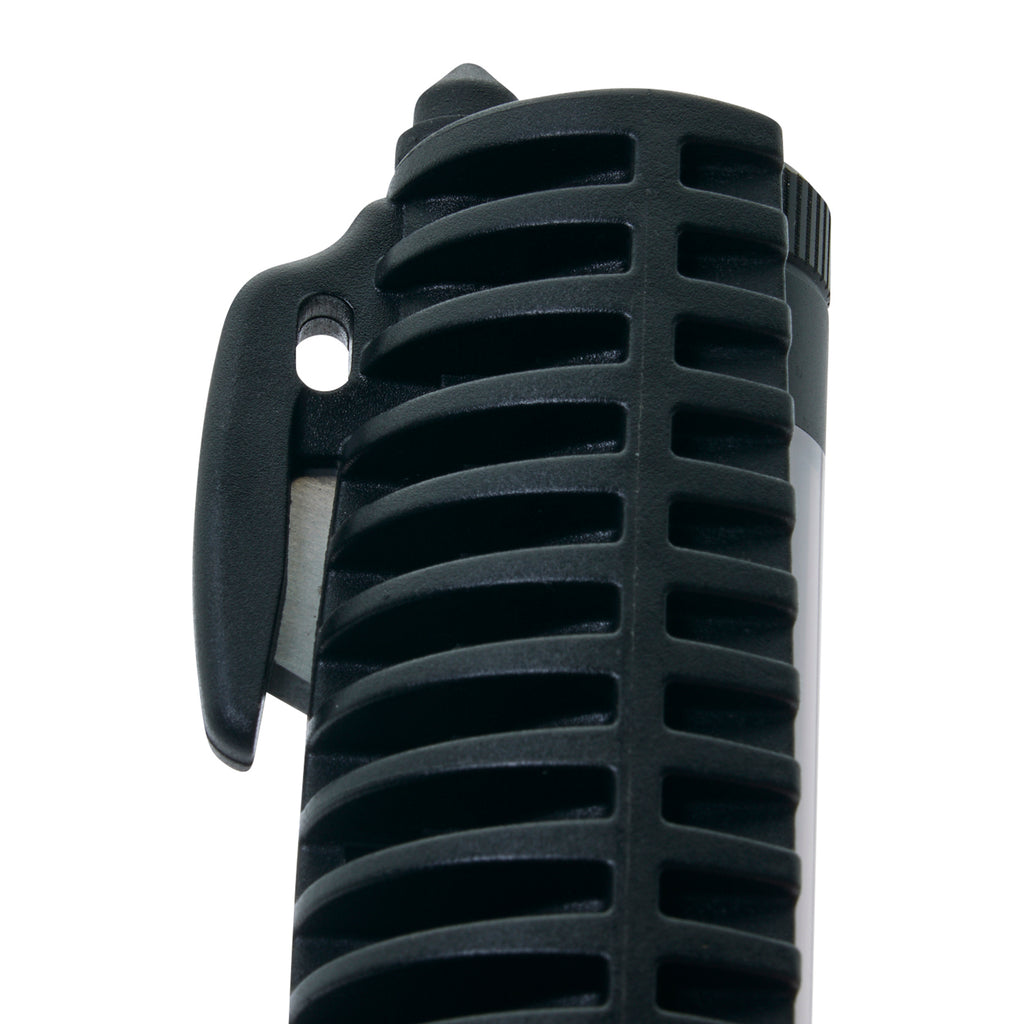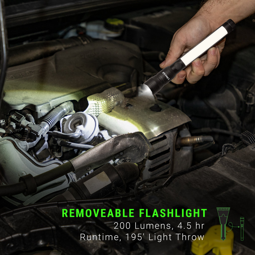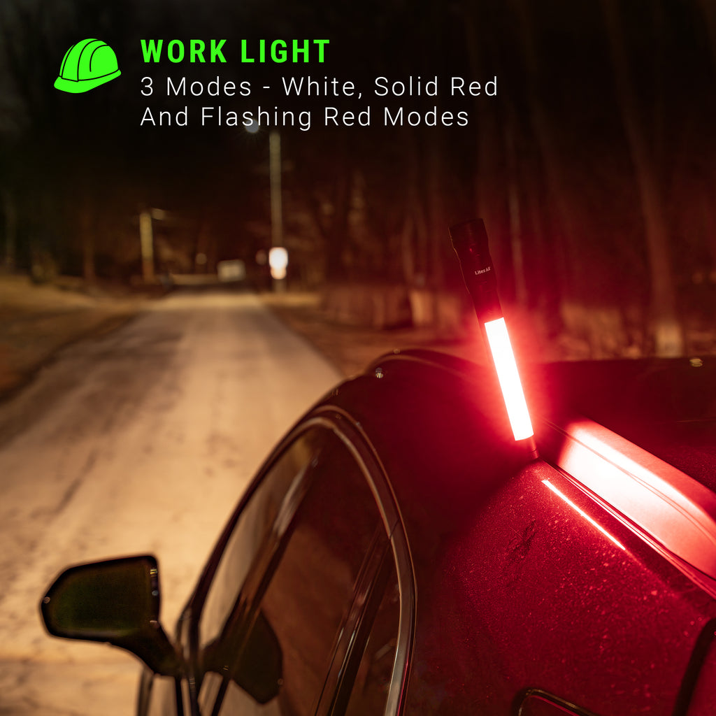 The utility flashlight features a 200 lumen front facing flashlight plus a 200 lumen side mounted light with white, solid red, and flashing red light modes.