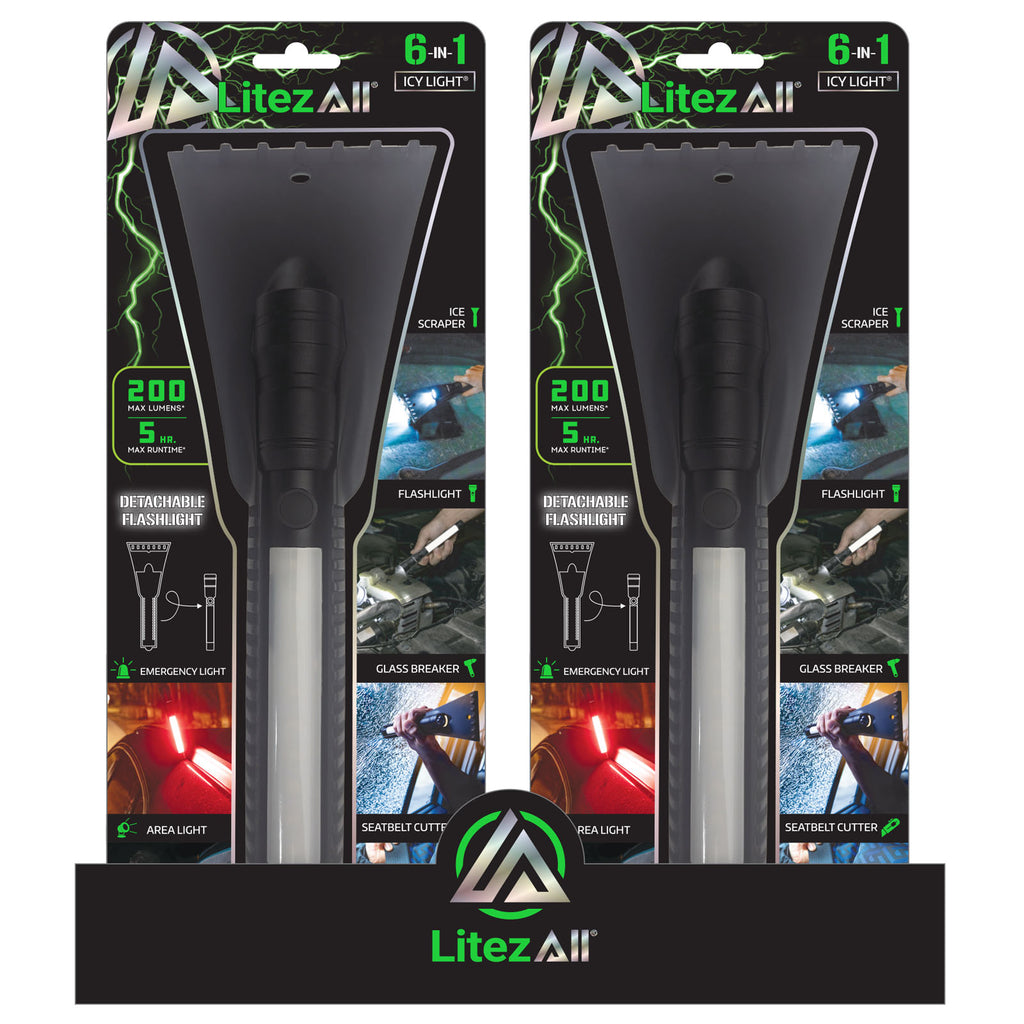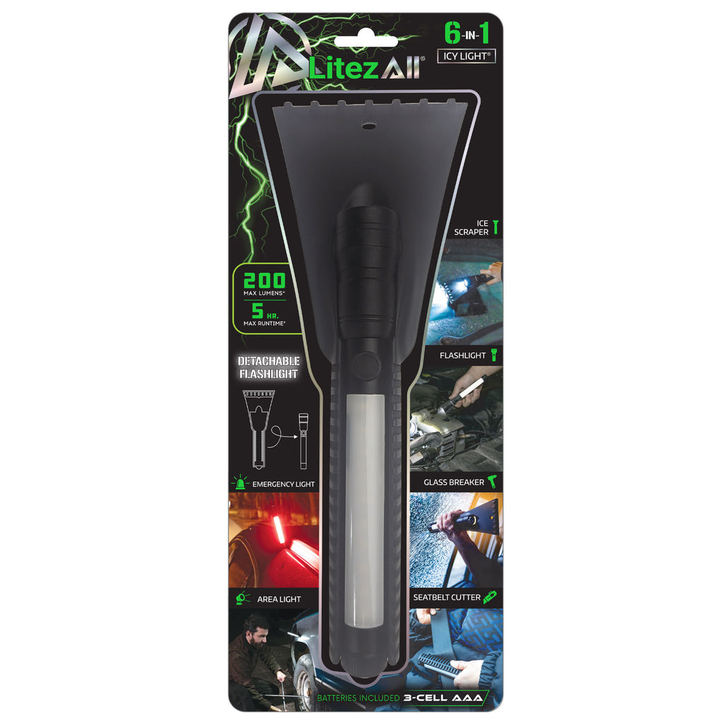 The LitezAll®The Evolution of Light® Icy Light  is more than just an ice scraper, because it includes a removable utility flashlight plus an integrated seatbelt cutter and emergency glass breaker.