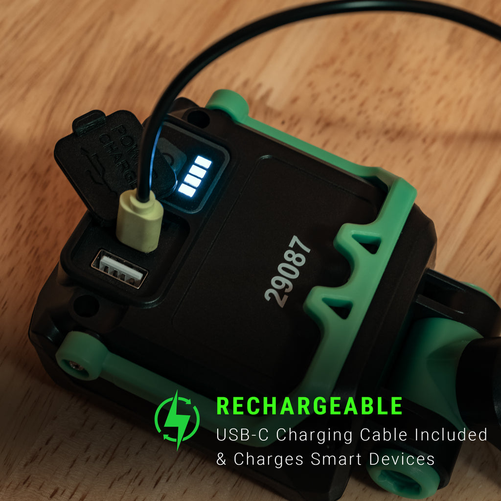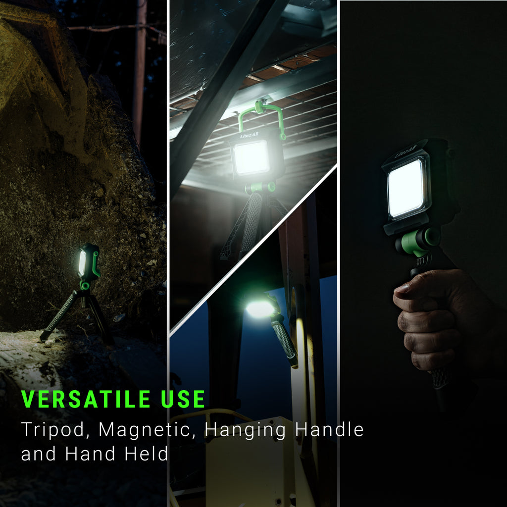 The LitezAll®The Evolution of Light® 2000 lumen rechargeable tripod work light is incredibly versatile and provides numerous ways to aim light exactly where you need it. It includes an integrated tripod stand and flip up adjustable hanging handle, plus strong base mounted magnets.