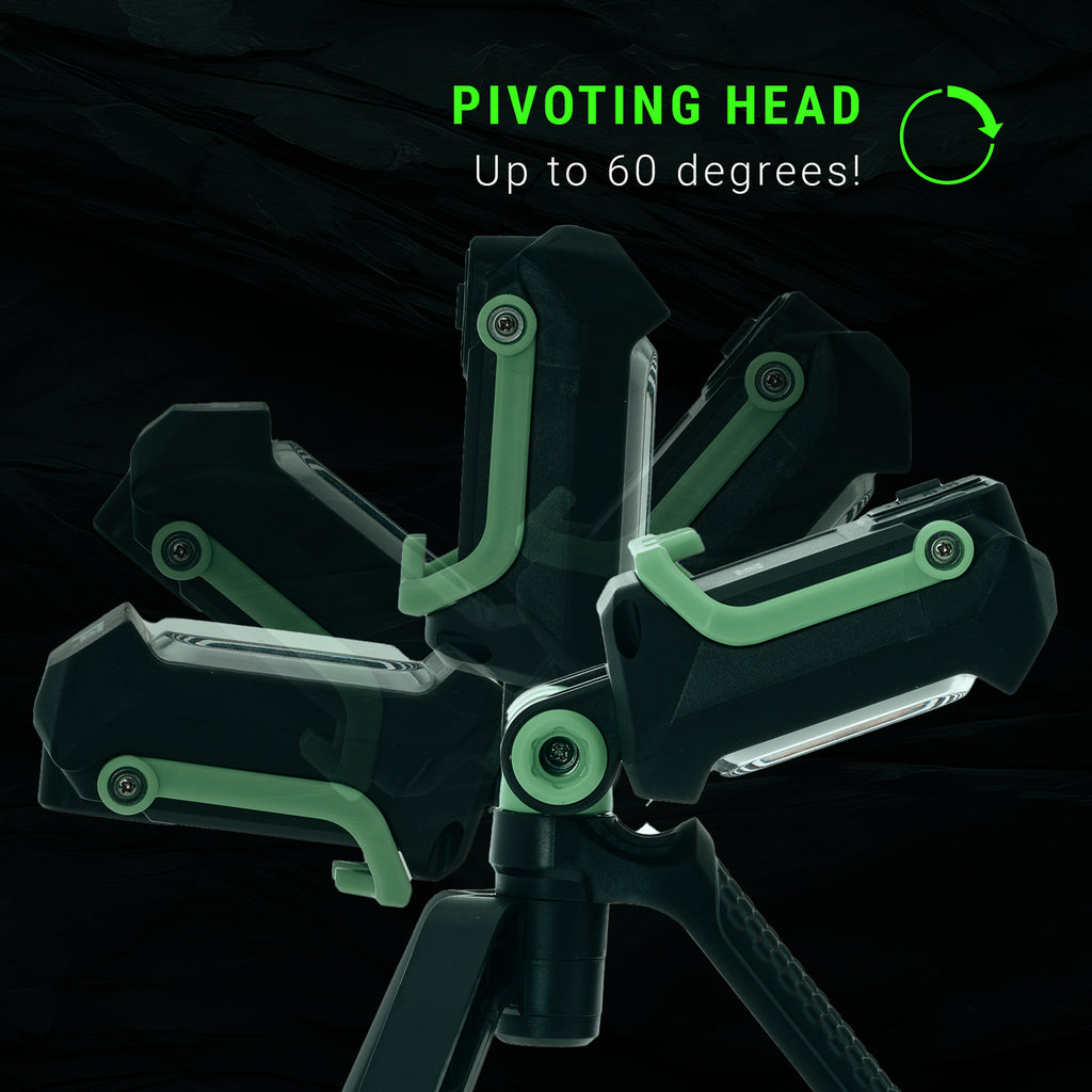 The body of the light pivots up to 60 degrees and rotates 360 degrees. The folded tripod doubles as a handle with rubberized grips.