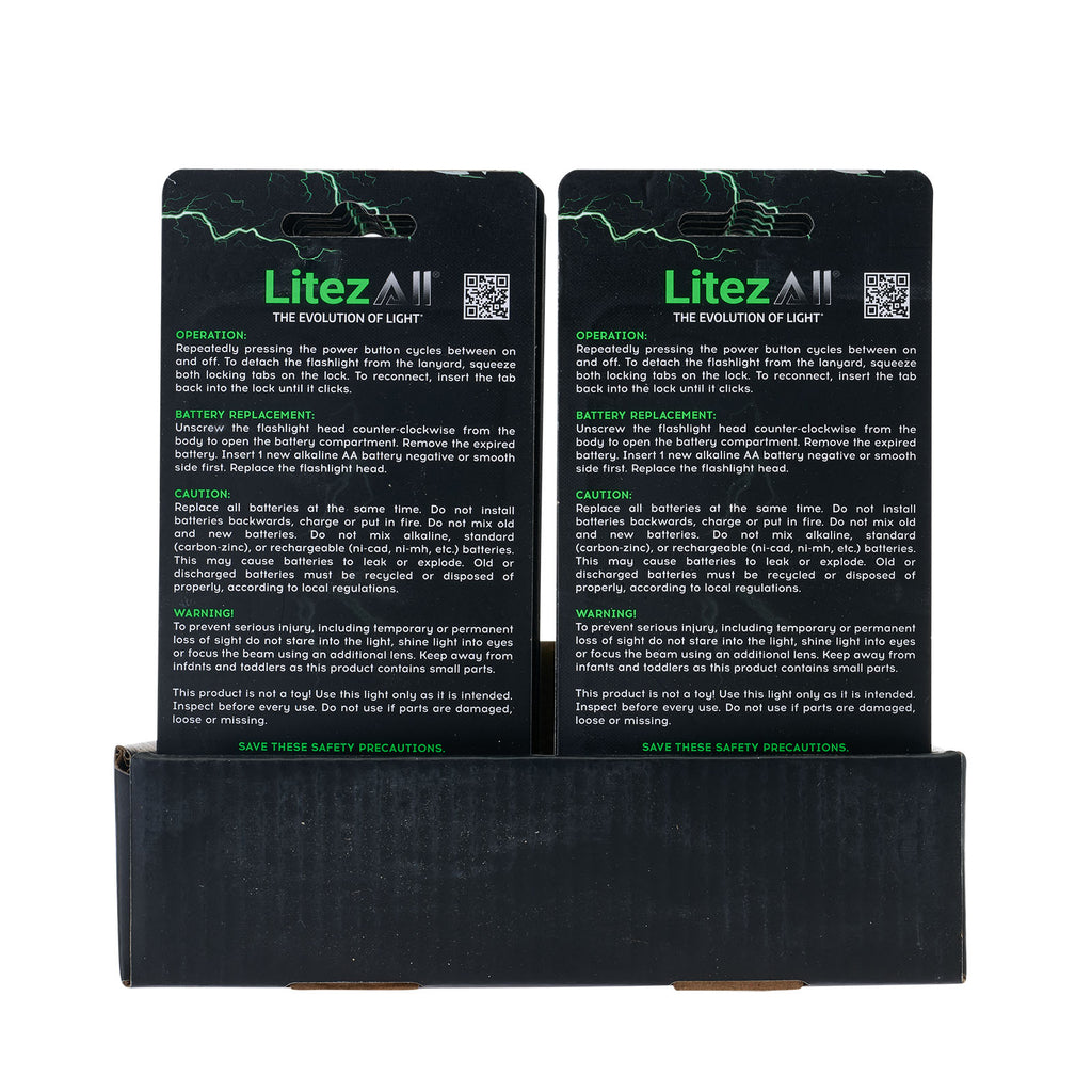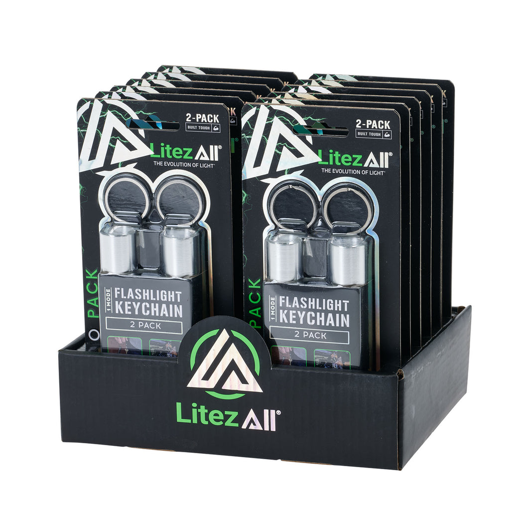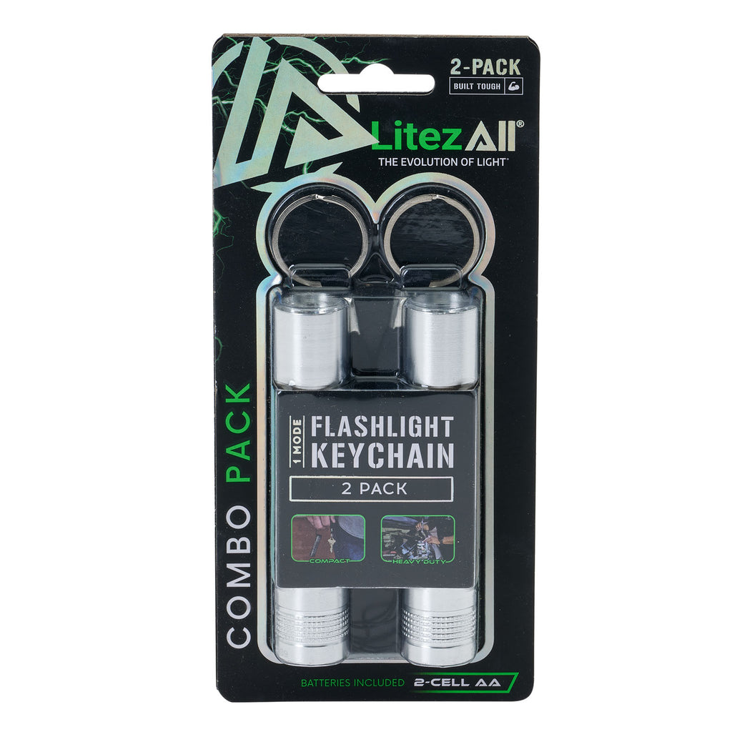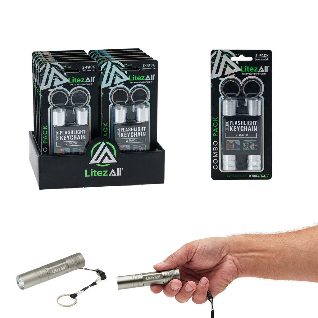 A 2 pack of LitezAll®The Evolution of Light® compact flashlight keychains. Features a detachable lanyard so you can use the keys and flashlight independently. Durable aluminum construction. 1 AA battery for each flashlight included.