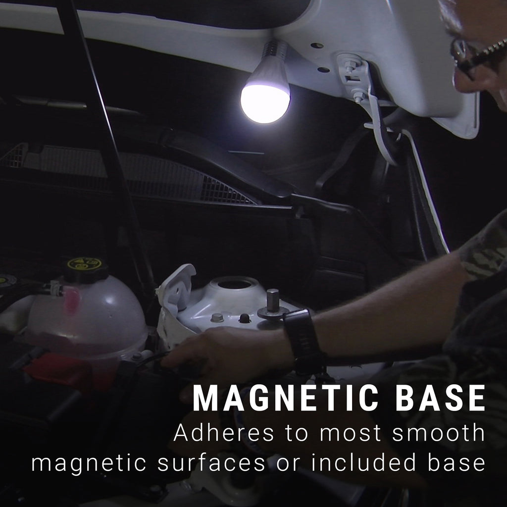 Use the LitezAll® PortaBulb® hands-free in its base or simply pull it out and use it as a Grab & Go® flashlight. The base of the PortaBulb® is magnetic and sticks to most smooth metallic surfaces. For added versatility, it features a flip out loop for convenient hanging.