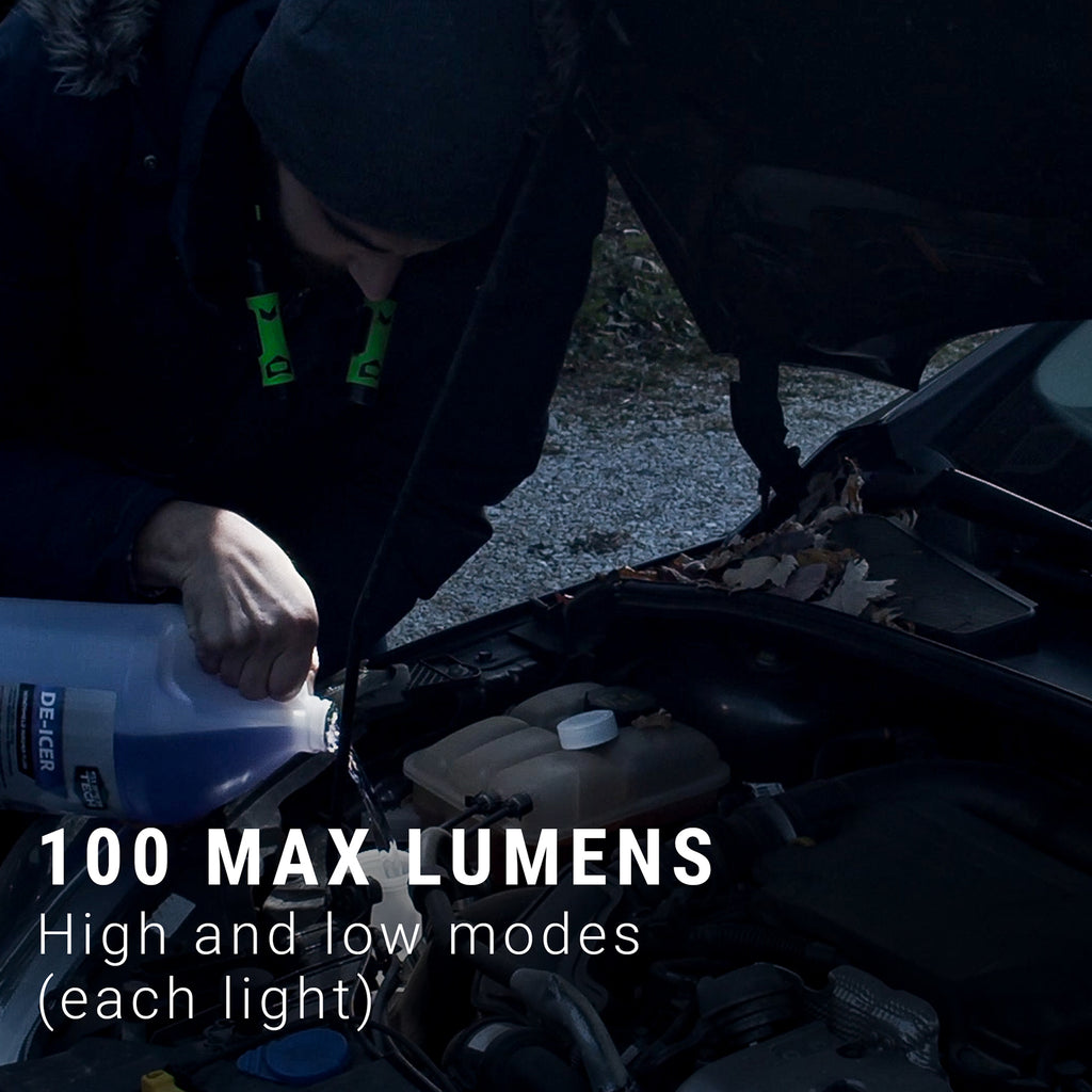 Each light features 100 and 50 lumen light modes and may be used independently.