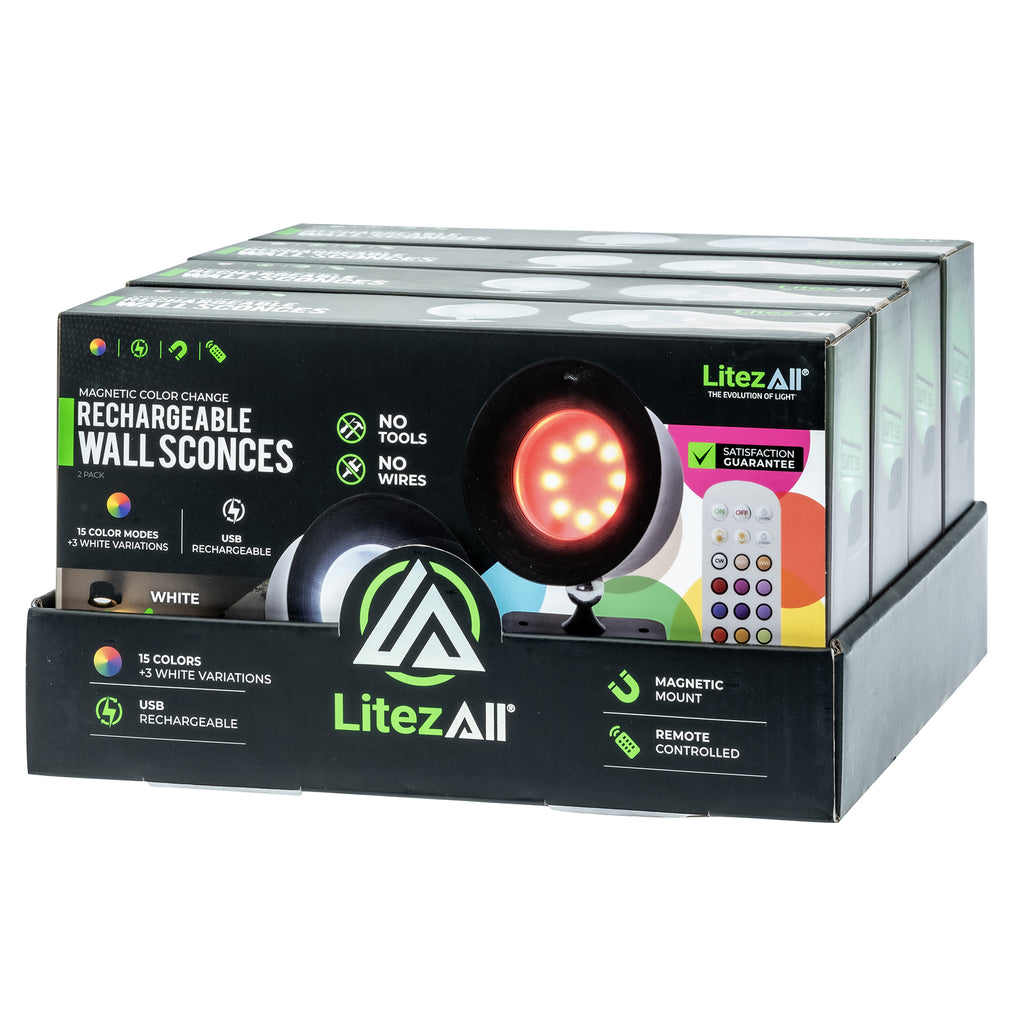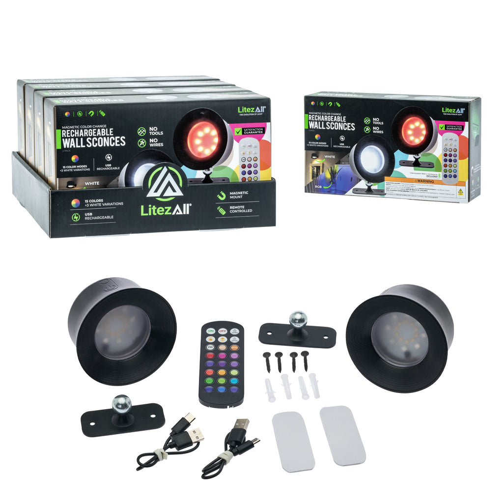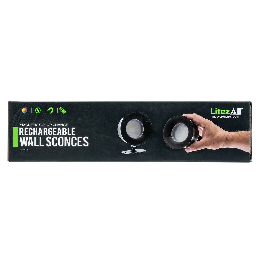 Add easy, cordless lighting anywhere with the LitezAll® Rechargeable Remote Controlled Wall Sconces. This 2-pack includes two lights with bases, a remote, mounting materials, and two USB-C charging cables for a complete, ready-to-use set. Turn each light on by tapping the power button, which activates the last used mode. Tap again to change colors, or press and hold to switch between low and high brightness.