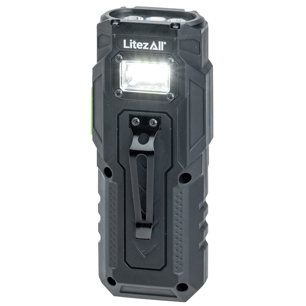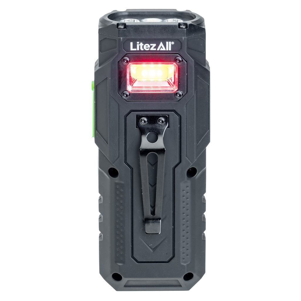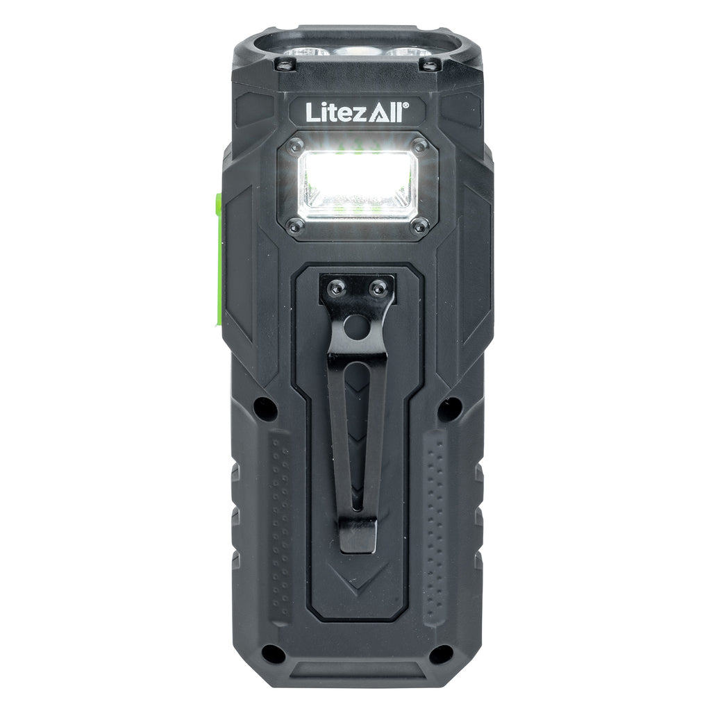 Stay prepared anywhere — the Litty® even charges your smart devices when you need extra power on the go. An integrated strong metal clip lets you secure or hang it easily, while a base-mounted magnet gives you hands-free lighting from any smooth, rust-free metal surface. Perfect for automotive repairs, camping, inspecting, hunting, or job site use.