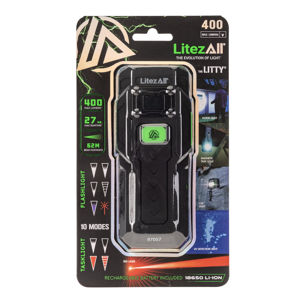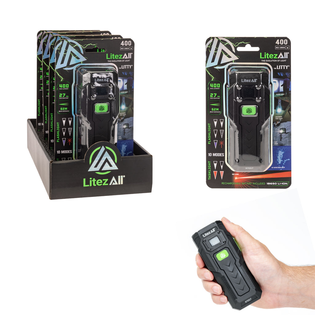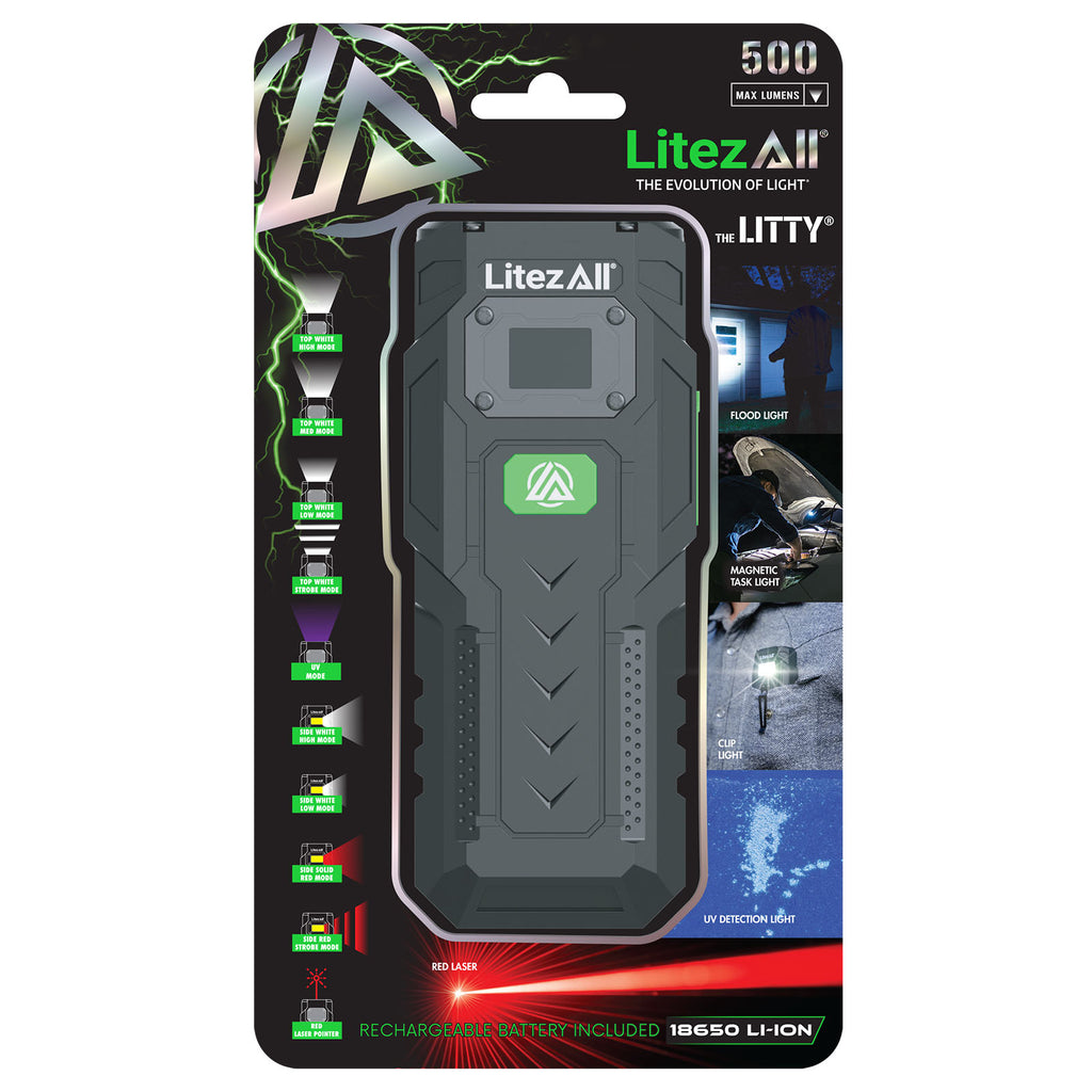 The Litezall® Litty® is the ultimate all-in-one light for work, adventure, and everyday use. Compact yet powerful, it delivers 10 unique lighting modes including high, medium, and low flashlight brightness, strobe and UV flashlight, high and low white floodlight, plus solid red and red S.O.S. floodlight modes for emergencies. Long press the power button to activate the built-in laser pointer, perfect for pinpointing objects at a distance.
