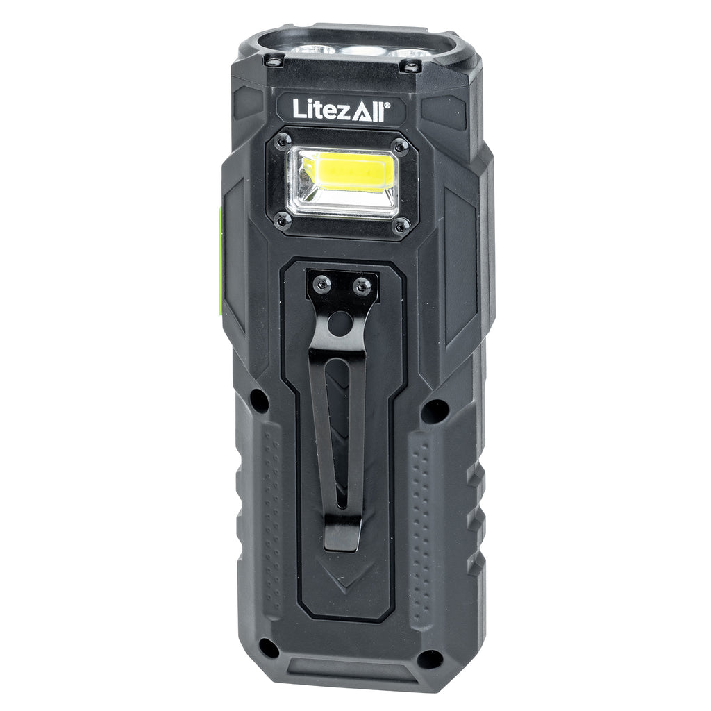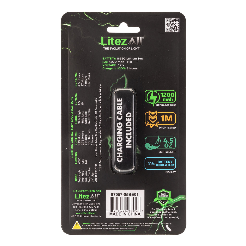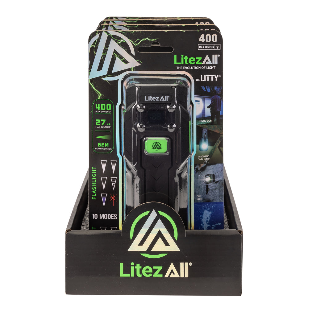 The Litezall® Litty® is the ultimate all-in-one light for work, adventure, and everyday use. Compact yet powerful, it delivers 10 unique lighting modes including high, medium, and low flashlight brightness, strobe and UV flashlight, high and low white floodlight, plus solid red and red S.O.S. floodlight modes for emergencies. Long press the power button to activate the built-in laser pointer, perfect for pinpointing objects at a distance.
